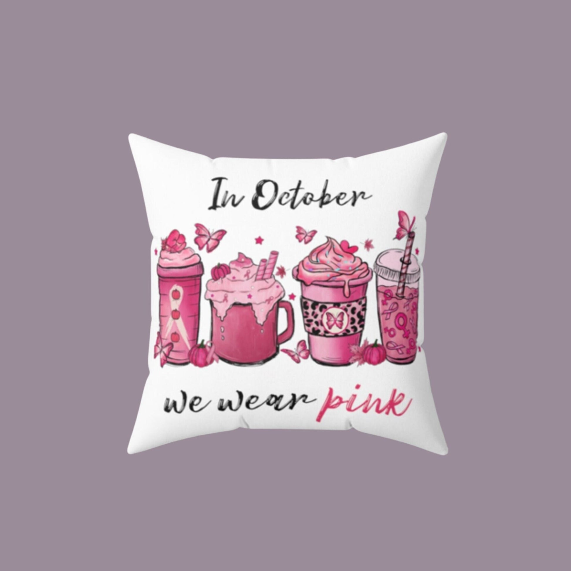 Our Breast cancer Awareness In October We Wear Pink graphic on our Polyester Double Sided Pillow, is the perfect addition to your Home Decor.