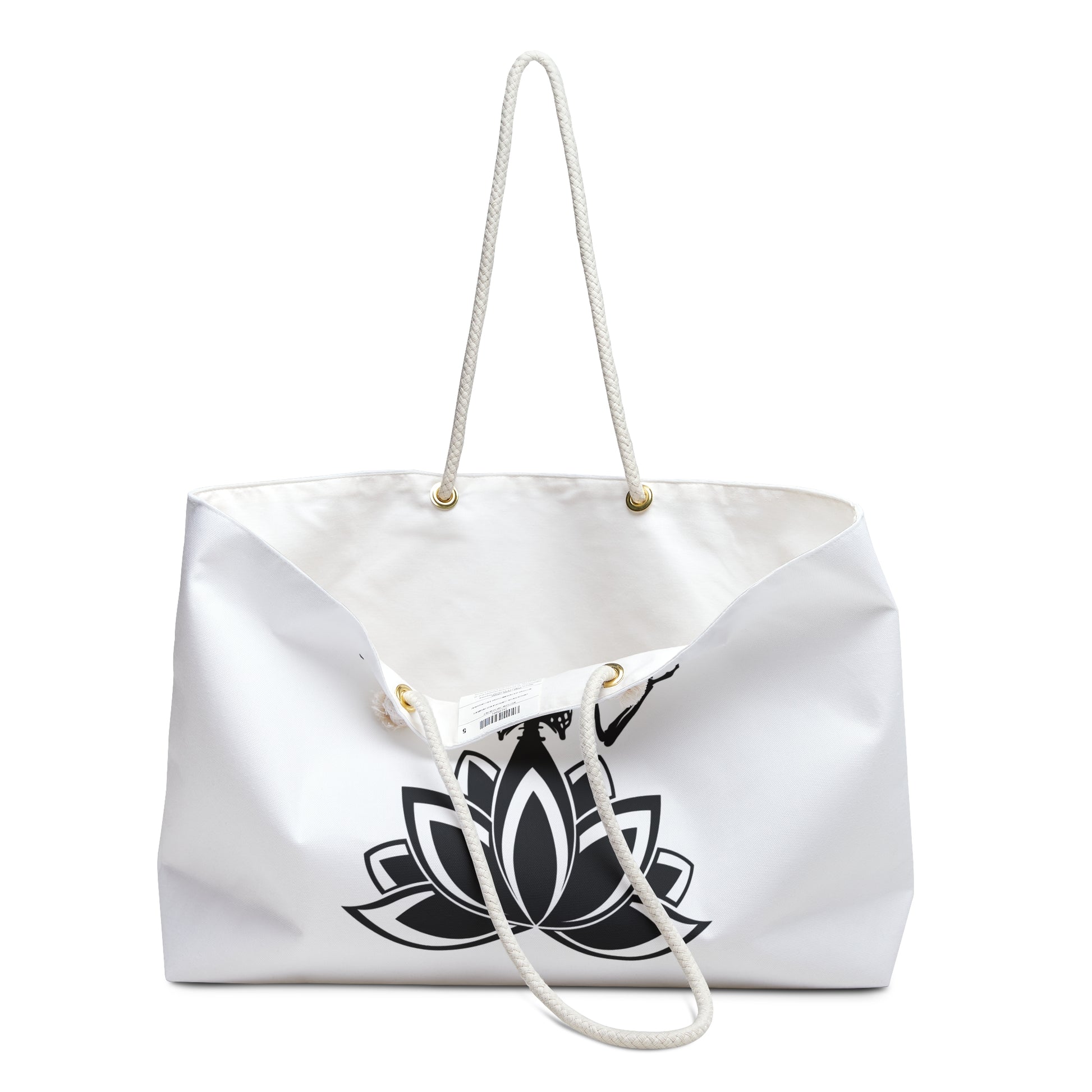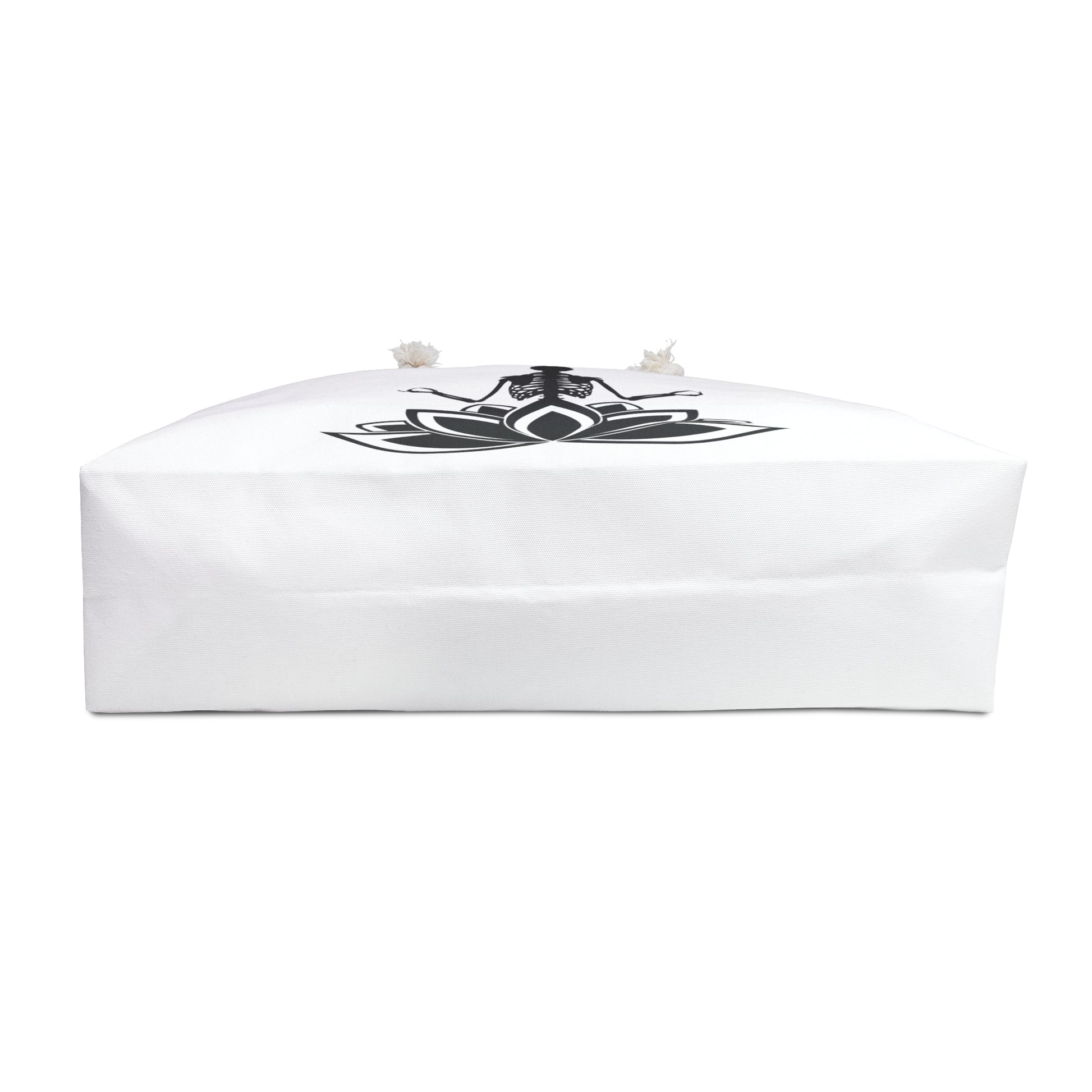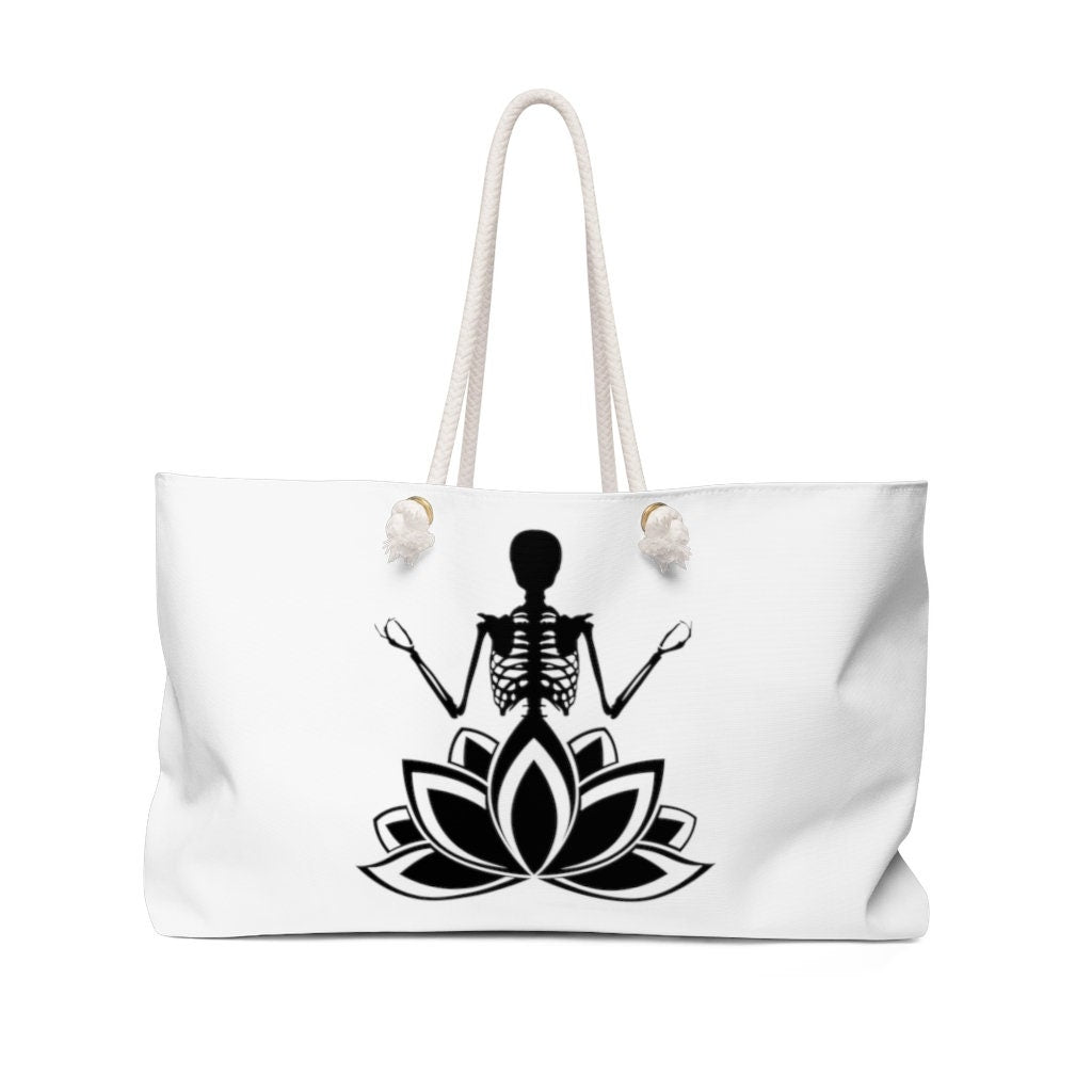 Our OM Yoga Skeleton Buddha on a Lotus Flower Tote Bag features black graphic on a white bag. This oversized Weekender Tote is perfect for your weekend at the beach or in town. The wide-mouthed, durable bag holds a generous amount of personal items and is easily held by its thick rope handles. Please note the design is on both sides of bag.