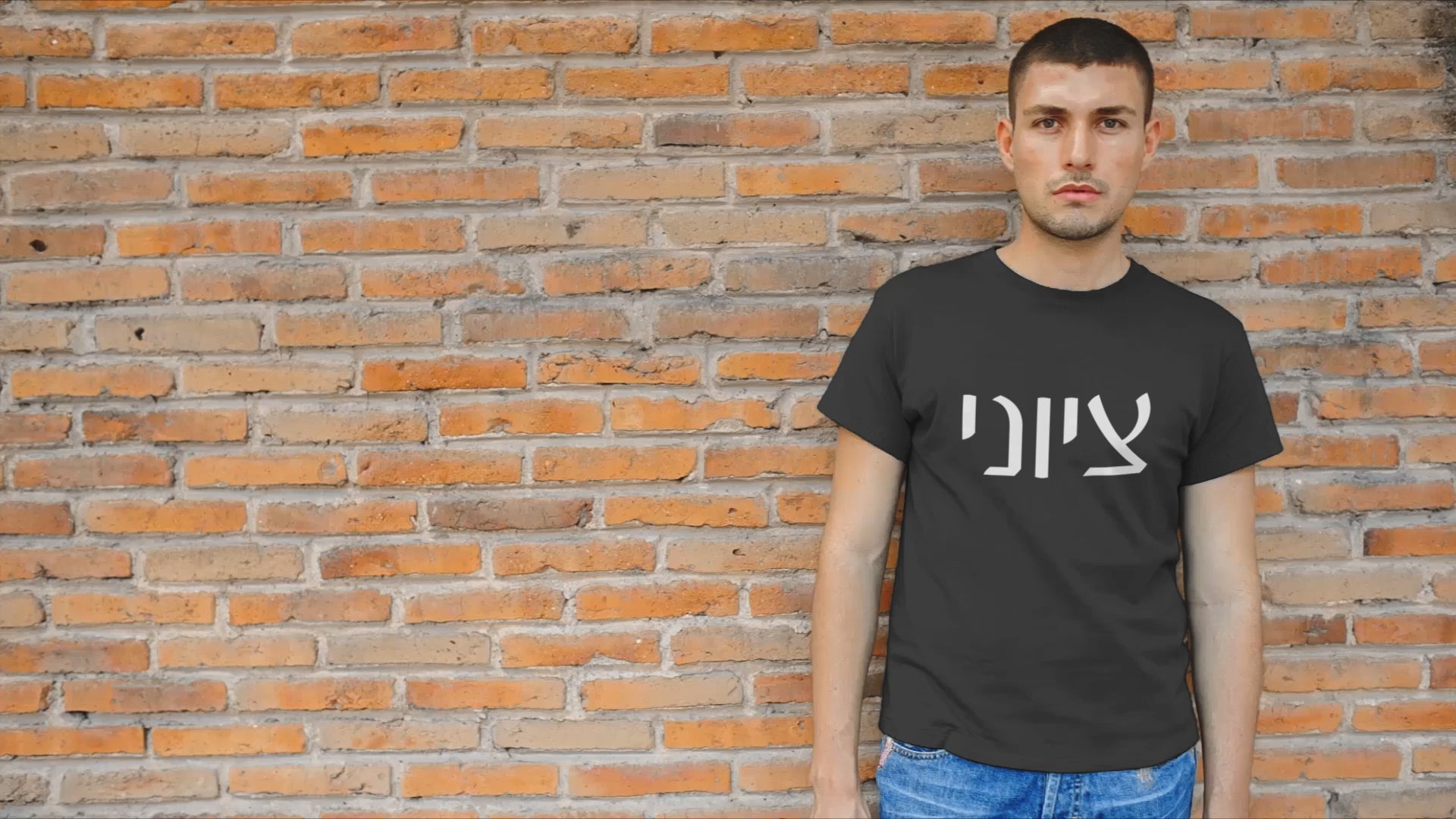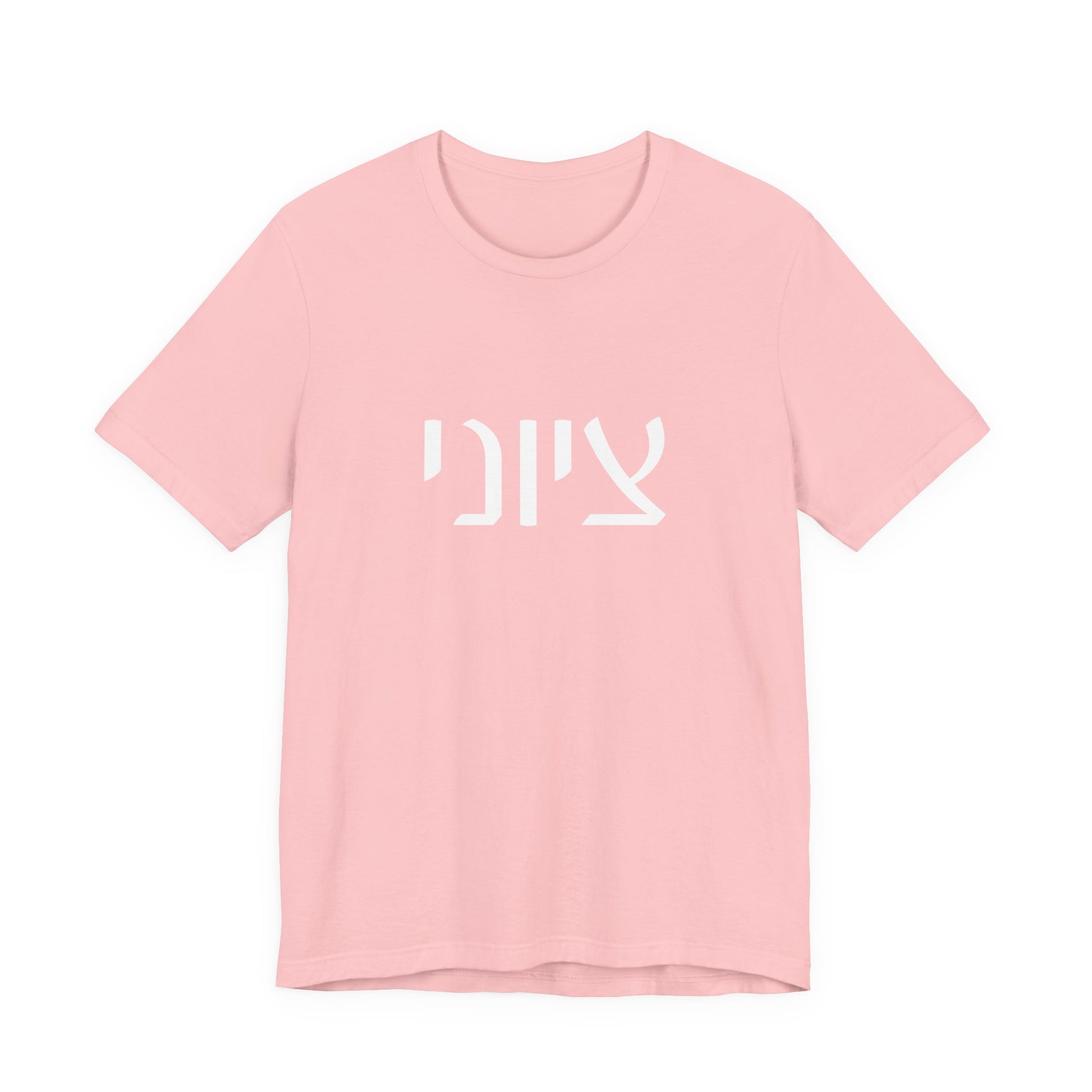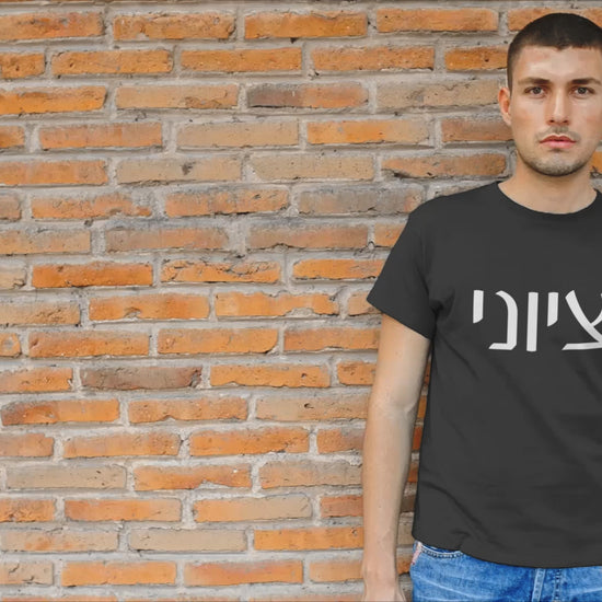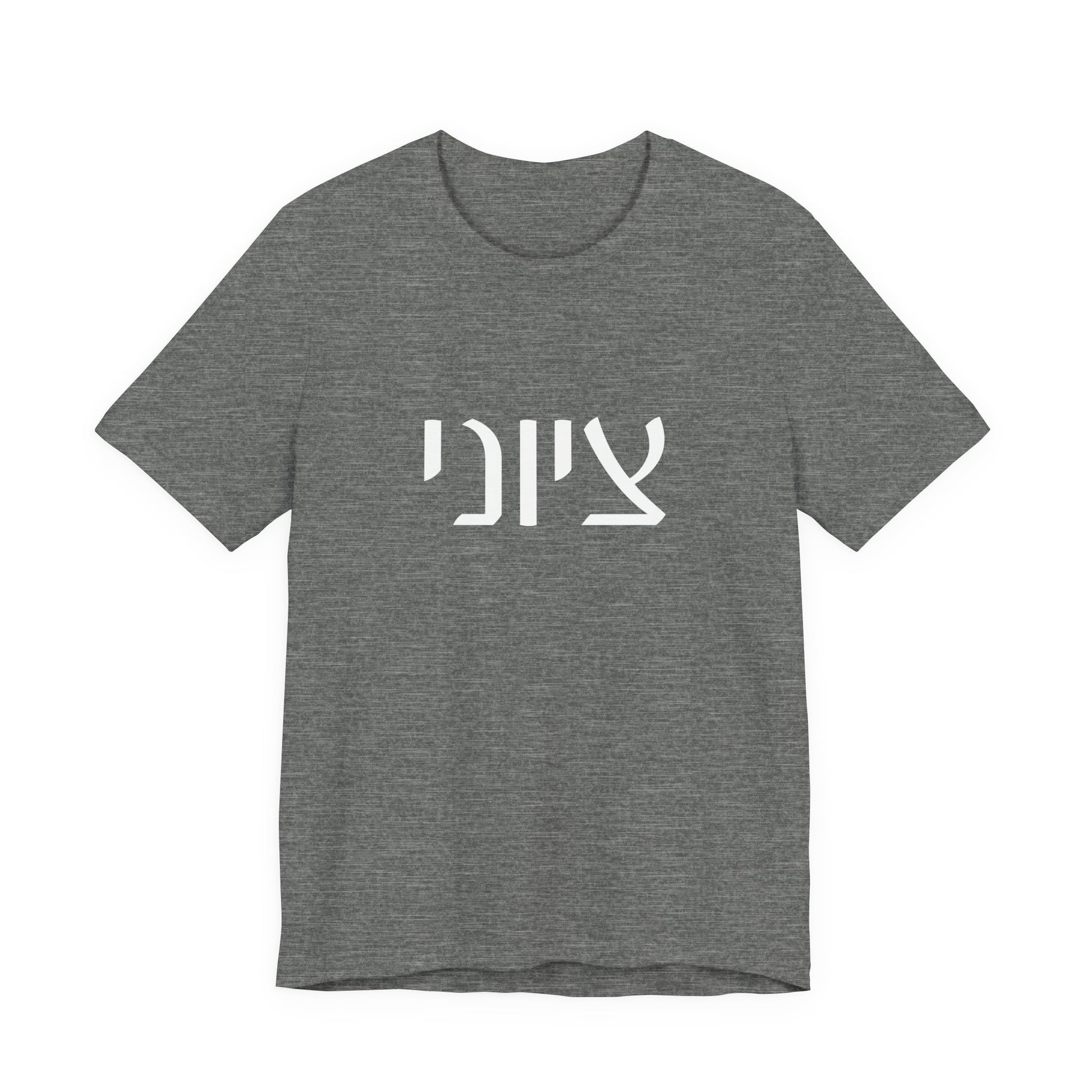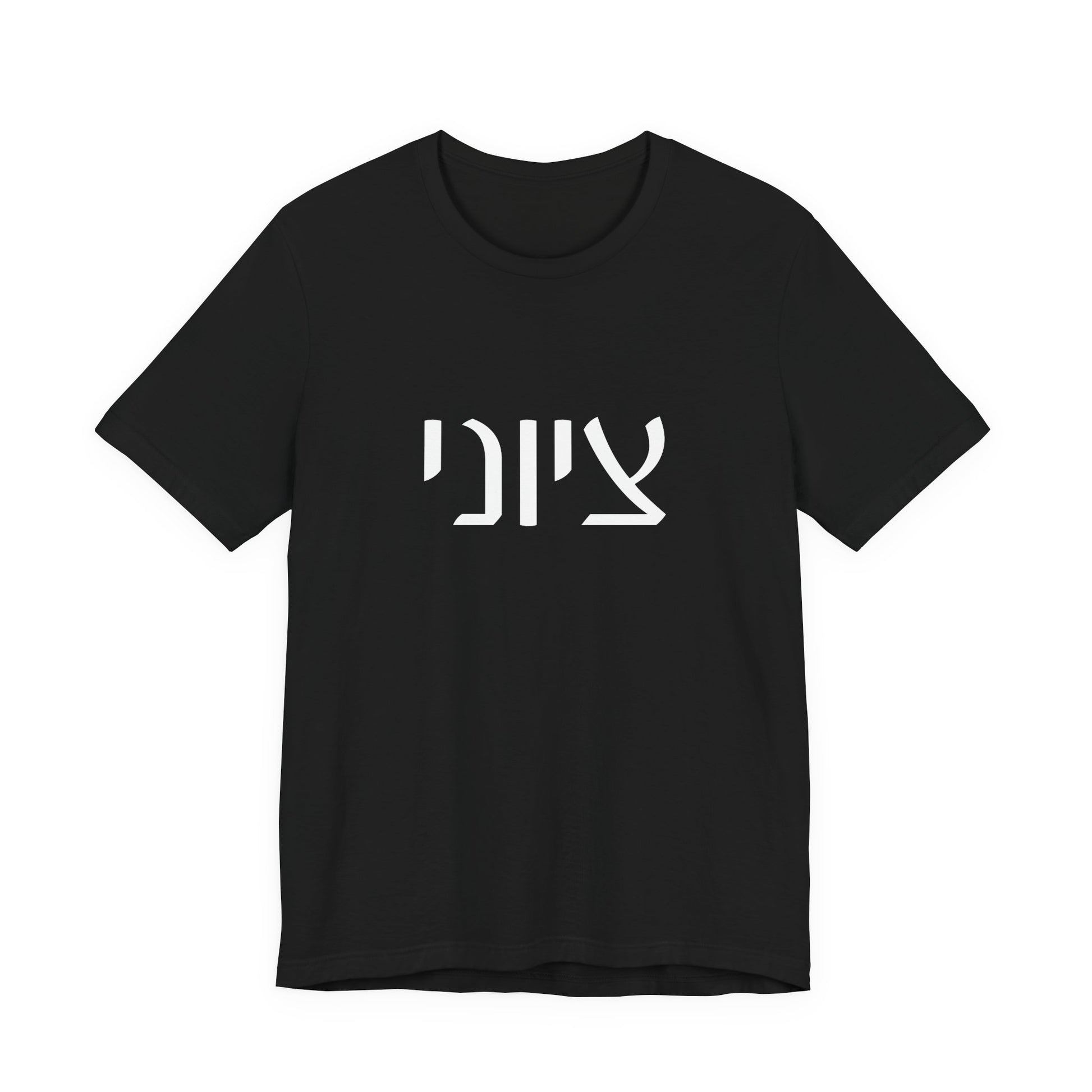 Our ZIONIST in HEBREW is shown here in the White Masculine 7M Spelling version - the female is also available - Graphic is featured on the FRONT of our Bella Canvas Unisex Tee.